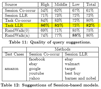 We compare query suggestion results to show difference among tasks, sessions, and click through bipartite graph. We build our task-based query suggestion model using different approaches including query co-occurrence, conditional likelihood ratio and random walk. We found that task-based query suggestion usually has higher quality than queries-based and session-based models, and can provide complementary results to other models. Supporting Materials: |